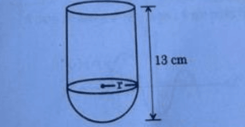 A cylinder of radius r is surmounted on a hemisphere of same radius. If total height of the object is 13 cm, then its inner surface area is :